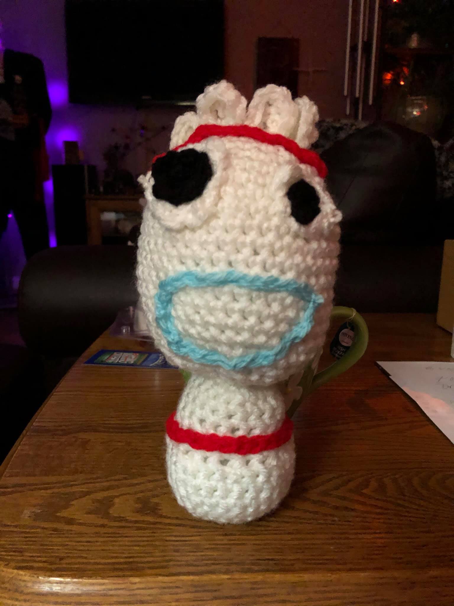 Last year a friend asked if I could make him Finn from Adventure Time. It was actually an easy pattern and I enjoyed it. Then he asked about Forky from Toy Story, so I did Forky.